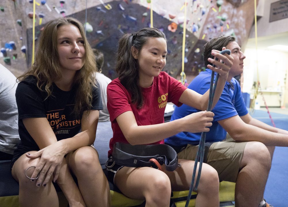 Amber Schnepp ’21, Nerissa Barling ’21, and Case Osborn ’21 take a break from the rock climbing wall to watch others during a Bridge Scholars outing to the CC climbing gym. Photo by Jennifer Coombes