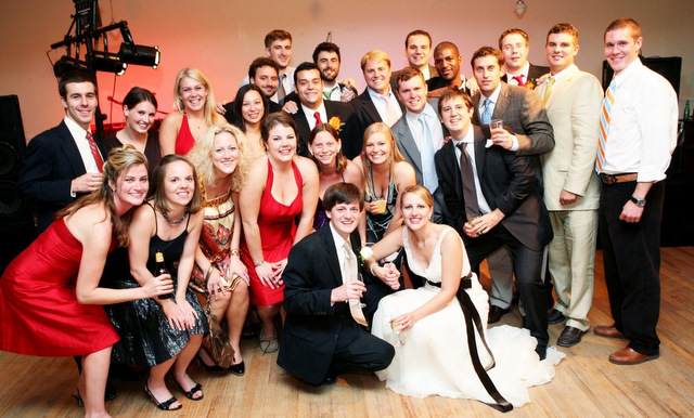 Attending the October 2008 wedding of Andrea Huston and Kyle Hewitt (both ’05, in front) in Austin, Tex.: (back row, left to right) Michael Walsh, Emily Green, Kelley Horeni, Jaime Kucinskas, Greg Piesco-Putnam, Chad Gleason, Ben Reyes, John Wilson, Richmond Holden, Dan Adams, Andrew Giaimo, Mandela Jones, Eliot Weiner, John Mack, Matt Garrow and Eli Baily, (middle row, left to right) Liz Gannon, Cullen Weaver Wold, Brianna McAleer, Haley Cornyn, Claire Smith, Amy Salm Wilson, and Spencer Pettine. Not pictured, Kate Sippel and Jedd Hart. All are from the Class of 2005.