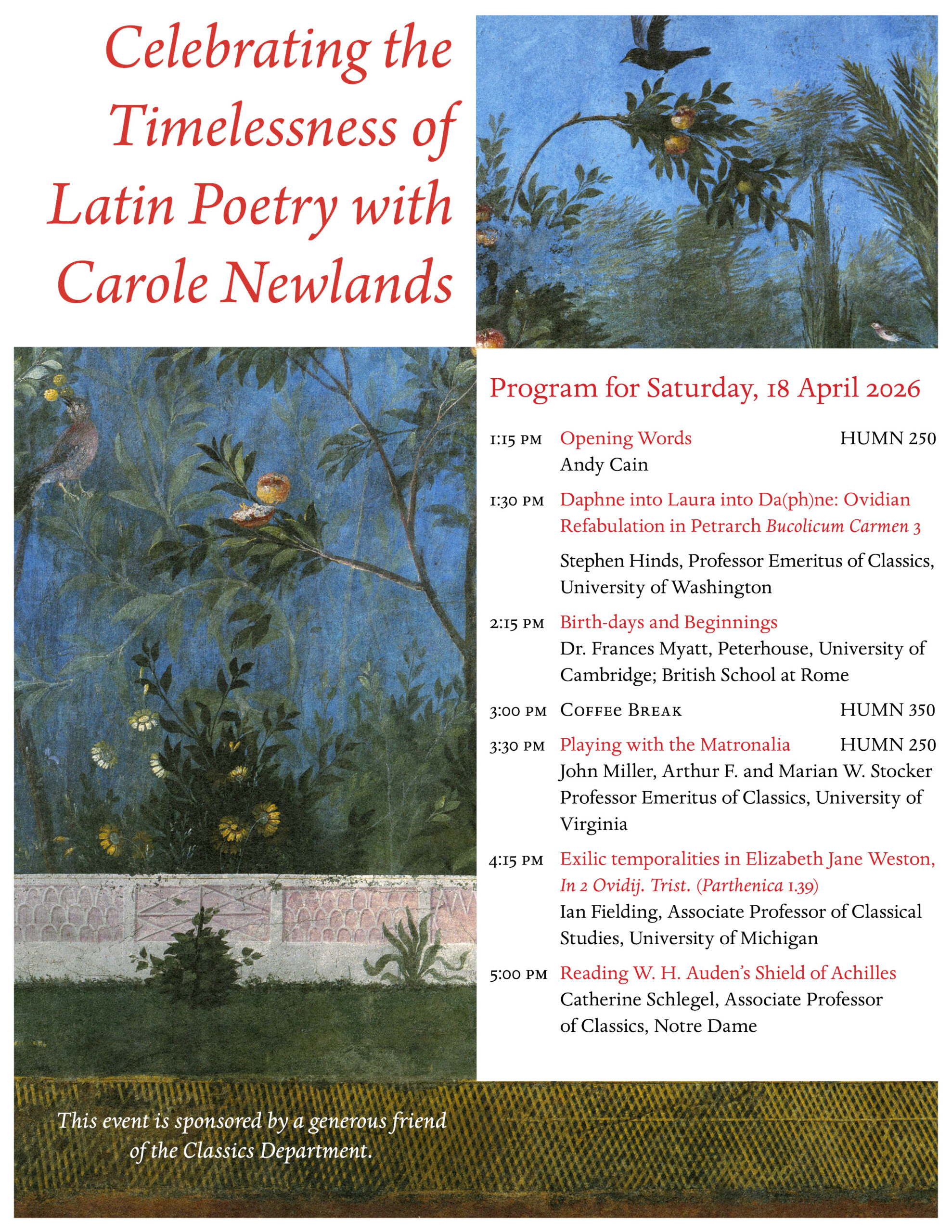 On Saturday, April 18, 1:15-5:45 pm in Eaton Humanities 250, the CU Boulder Classics Department will host “Celebrating the Timelessness of Latin Poetry with Carole Newlands,” an all-day celebration of Professor Newland’s distinguished career. Five honored guest presenters will offer talks on works of Latin literature from the Classical Period to the Renaissance and beyond. Details of the program may be viewed here.