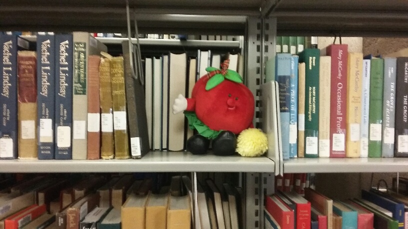 Further further addendum, September 2015: we did it again, and this time one of the plushies turned up on a high shelf with an inscrutable letter. Another, a cheerleading tomato (apparently), was found in the stacks.