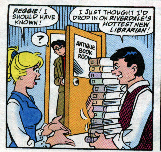 Betty & Veronica Friends issue 2014, published in 2011, includes “Librarians on the Loose,” in which Betty takes a job at her local library. Sexual harasser and all around general prick Reggie teases Betty about libraries being boring…