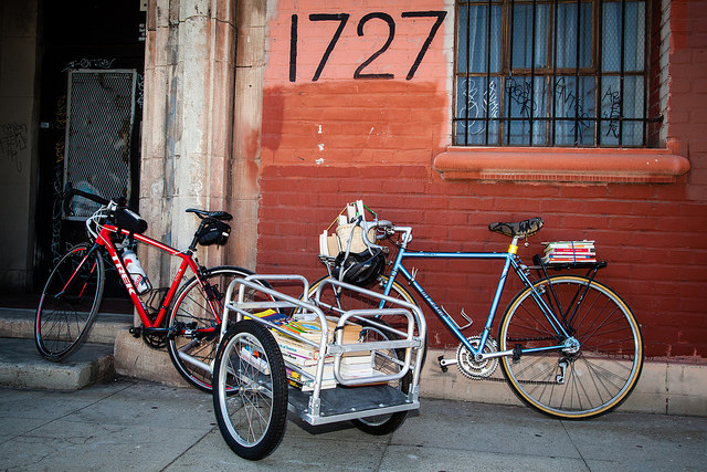 The Feminist Library on Wheels (F.L.O.W.) in Los Angeles, CA lends books from bicycles. Yes they do! The collection is cataloged with LibraryThing and they are accepting donations of books and money. They have a handy wishlist online. Thanks, Bust Magazine!