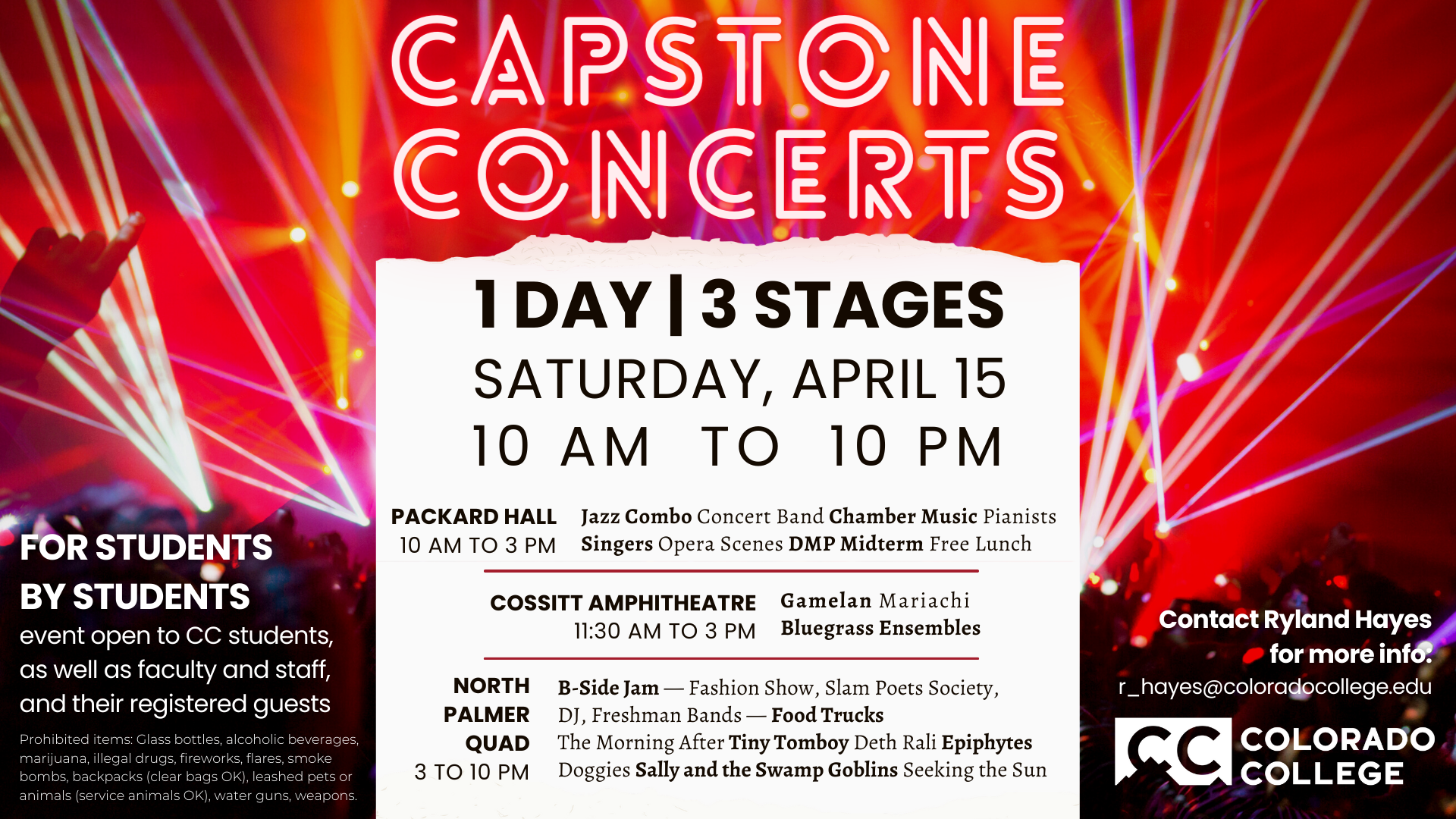 Today from 10:00 a.m. to 10:00 p.m. Packard Performance Hall  Capstone Concerts is from 10 a.m. to 10 p.m. Saturday, April 15, in three venue… Add to calendar: Apple/Outlook | Google