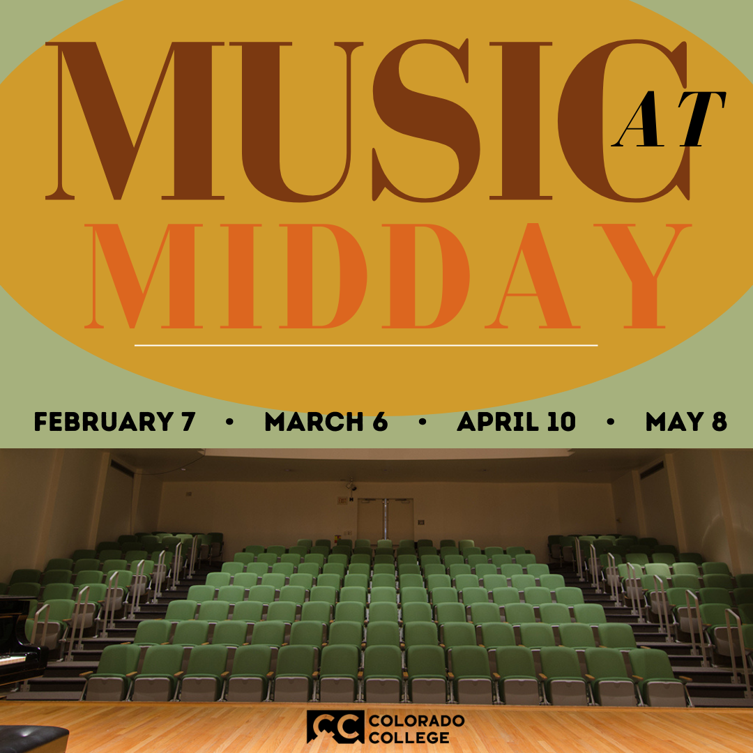 Today from 12:15 p.m. to 1:15 p.m. Packard Performance Hall  The Colorado College Department of Music presents Music at Midday stu… Add to calendar: Apple/Outlook | Google