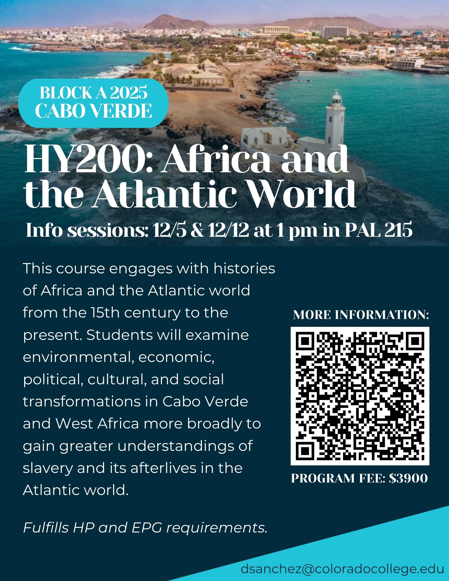 Thursday, December 12, 2024 from 1:00 p.m. to 2:00 p.m. Palmer Hall 215  Block A 2025 in Cabo Verde HY200: Africa and the Atlantic World Taught by… Add to calendar: Apple/Outlook | Google
