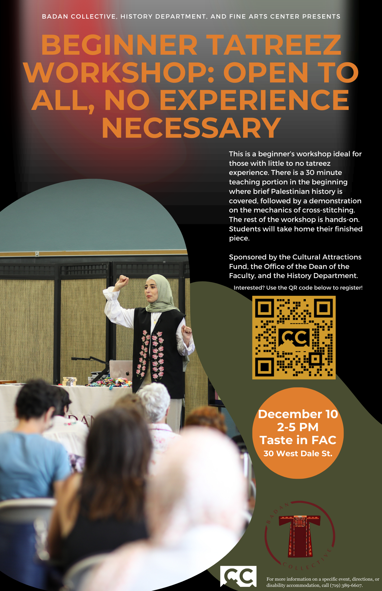 Today from 2:00 p.m. to 5:00 p.m. Taste in the Fine Arts Center (FAC)  This is a beginner’s workshop ideal for those with little to no tatreez experience. There is a 30 mi… Add to calendar: Apple/Outlook | Google