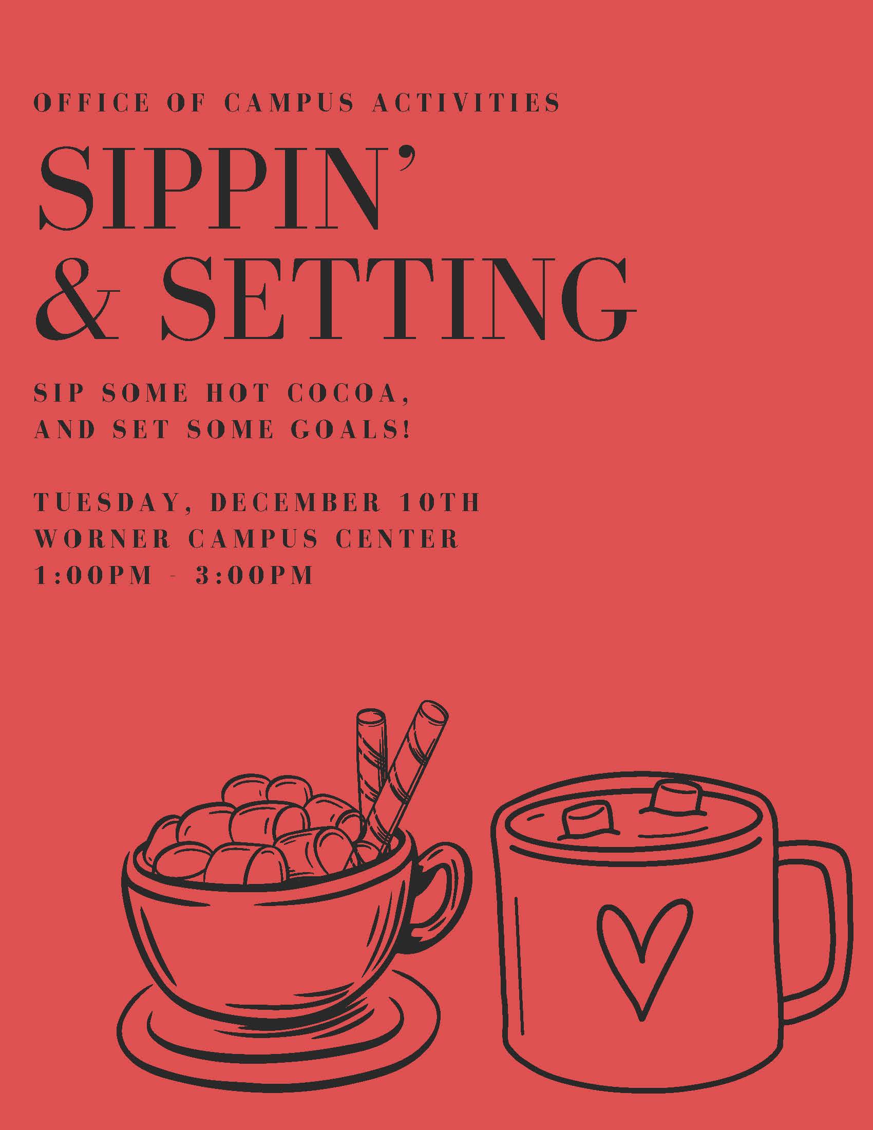 Today from 1:00 p.m. to 3:00 p.m. Worner Fireside Join the OCA Staff to drink some hot cocoa and set some goals for next semester! We will be outside of Rastalls Dining Center on Tuesday, December 10th from 1-3pm.