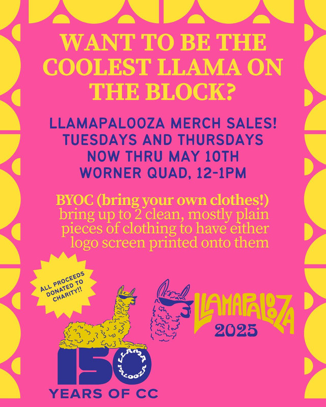 Ready to turn your swag on? Come get your Llamapalooza Merch! Tuesdays and Thursdays, now through May 10th Worner Quad, …
