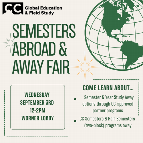 Friday, September 5, 2025 from 12:15 p.m. to 1:15 p.m. Tutt Library 238  Are you hoping to study abroad/away during your time at CC, bu… Add to calendar: Apple/Outlook | Google